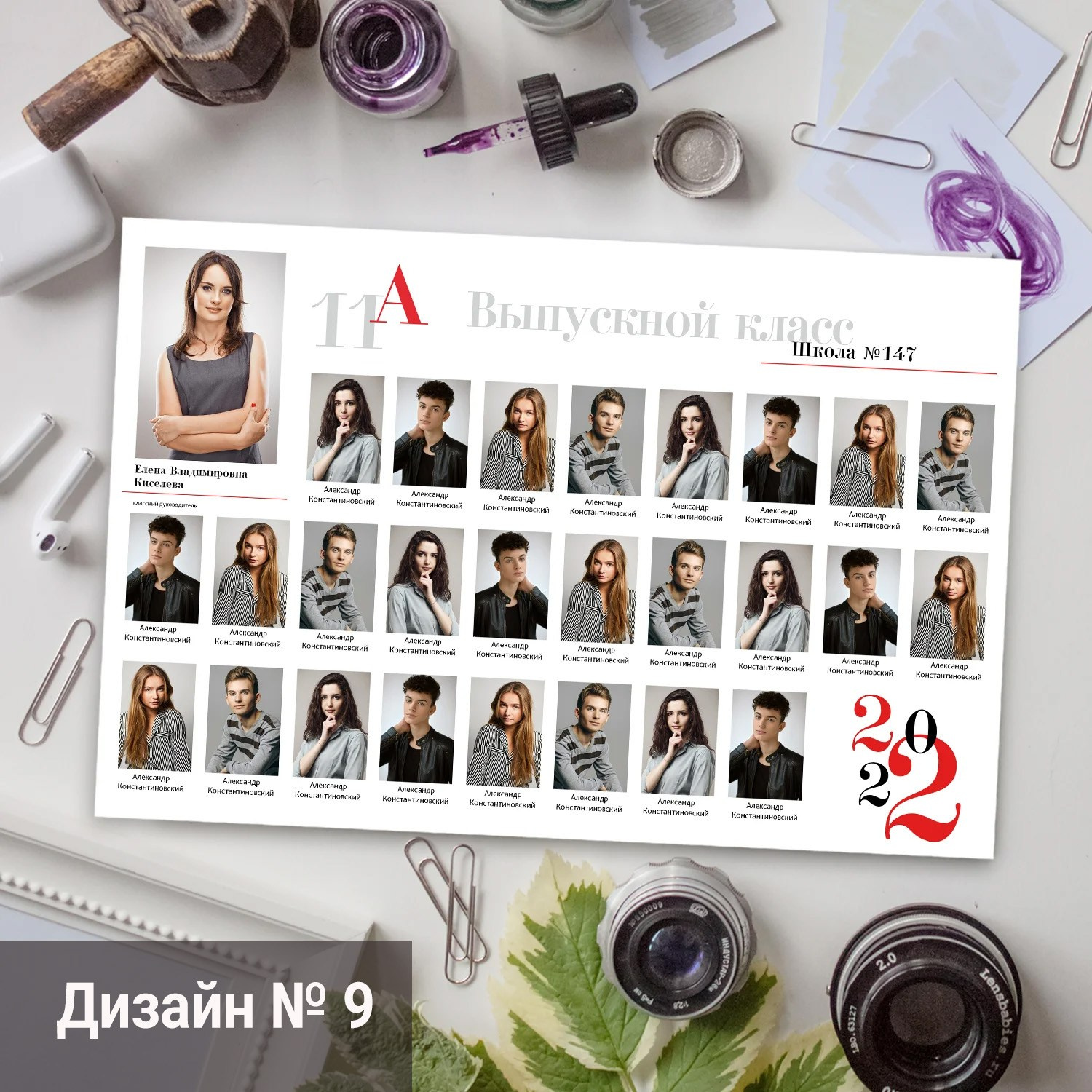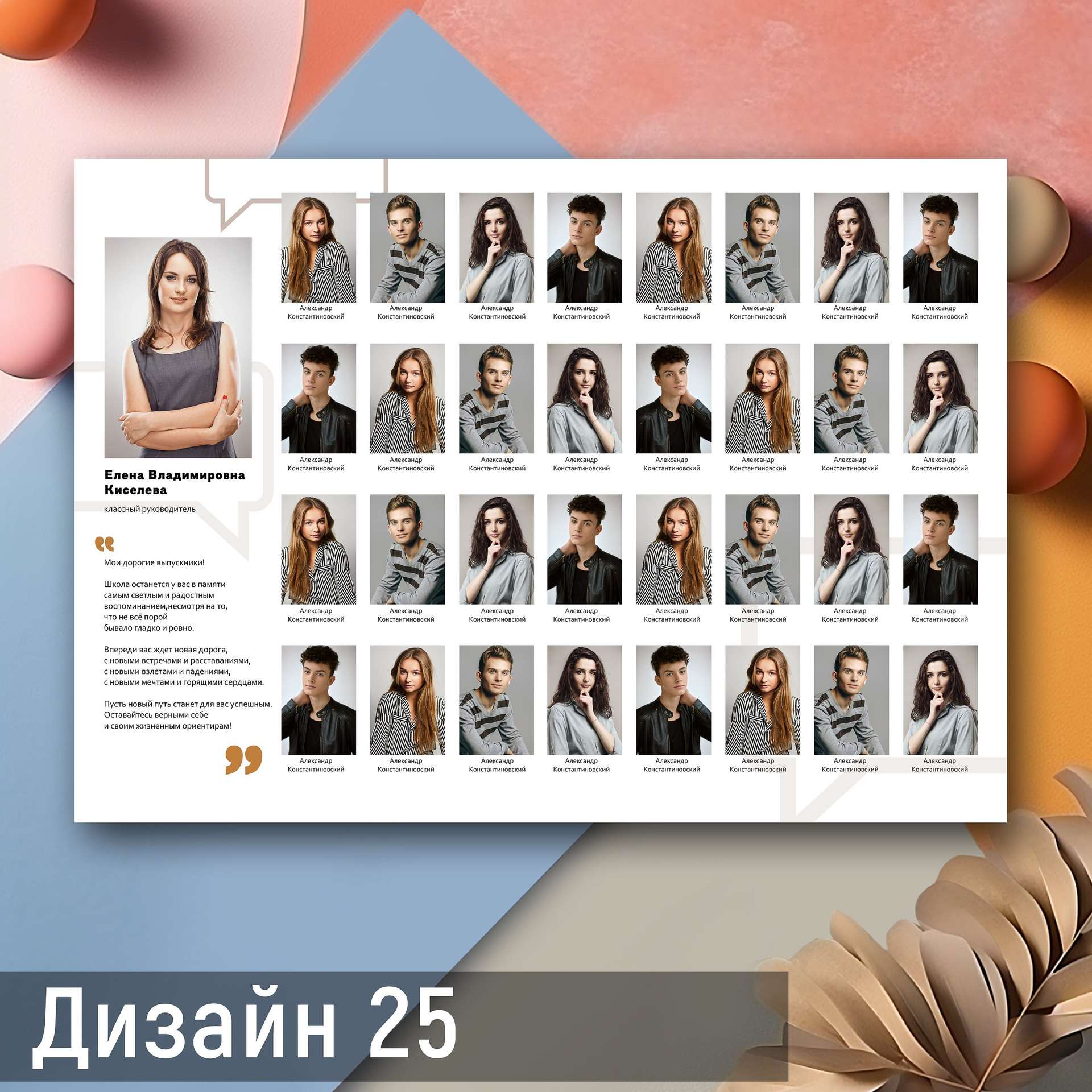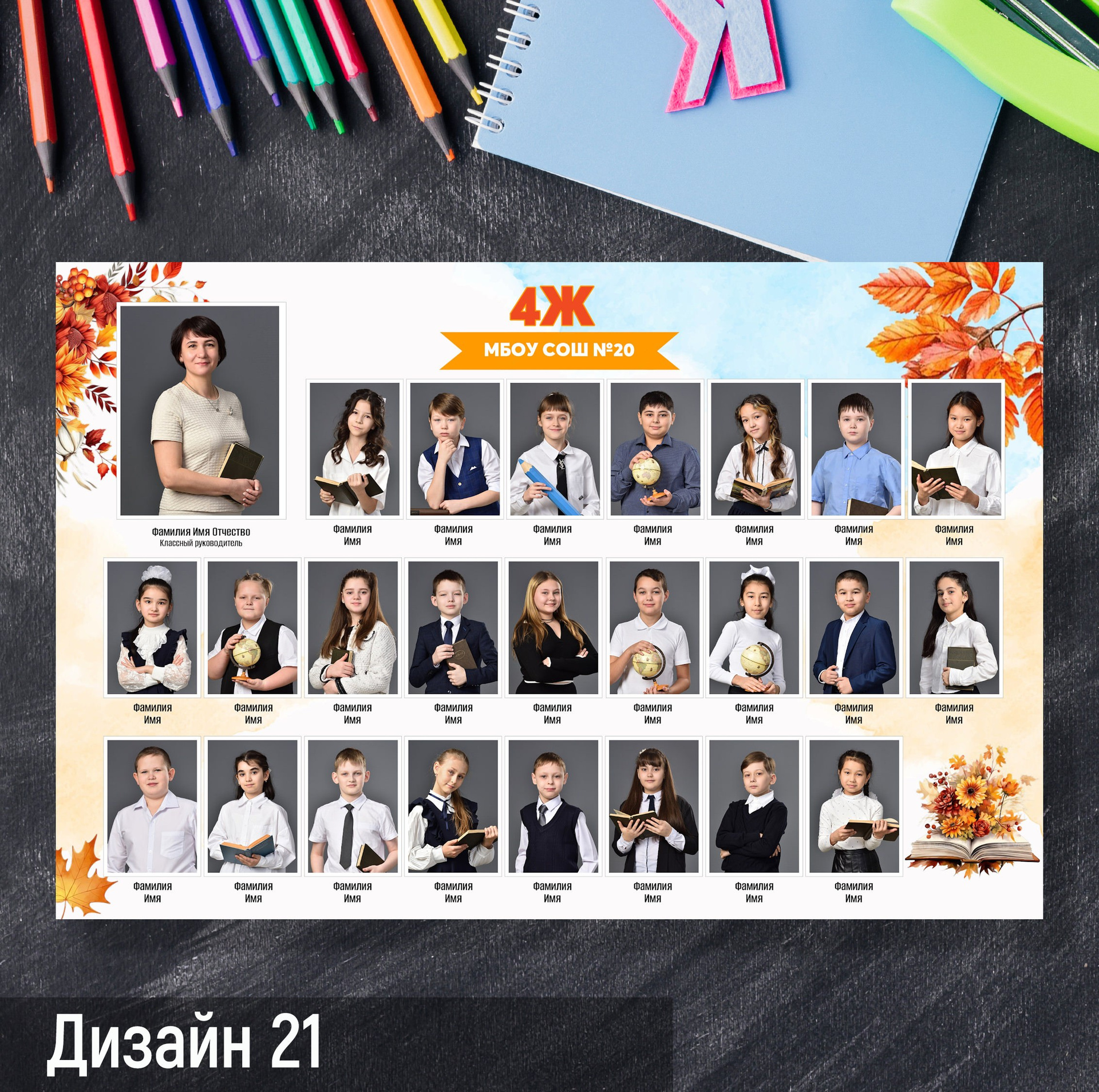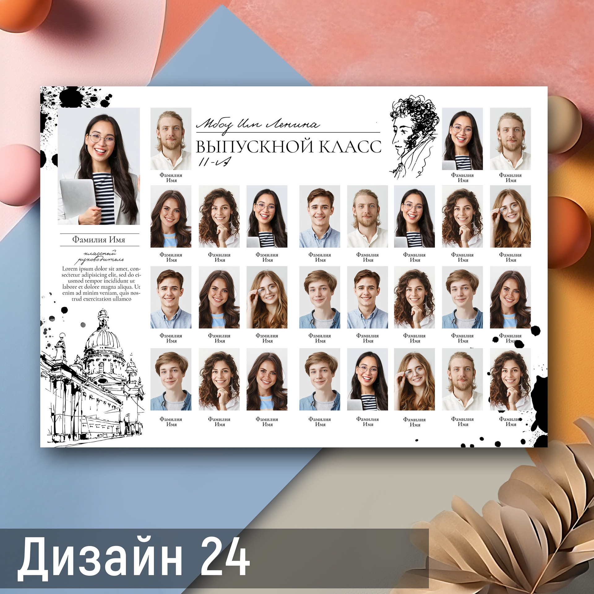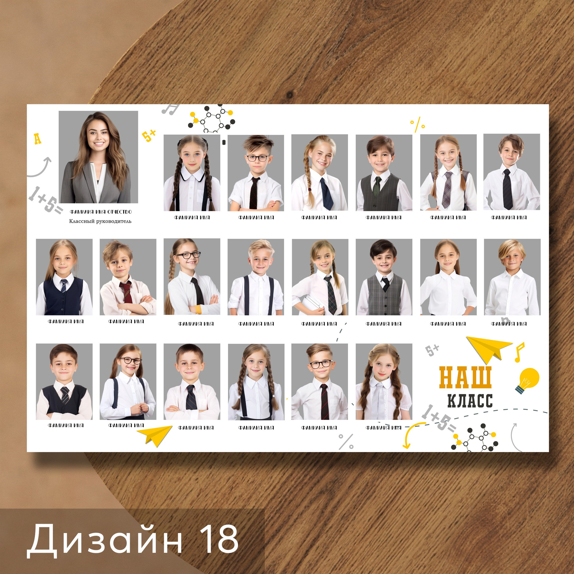 - ✔️ Фон портретов, вид и расположение портретов на виньетке может отличаться от представленных, в зависимости от количества учеников и метода съемки (фото стоя либо за партой).