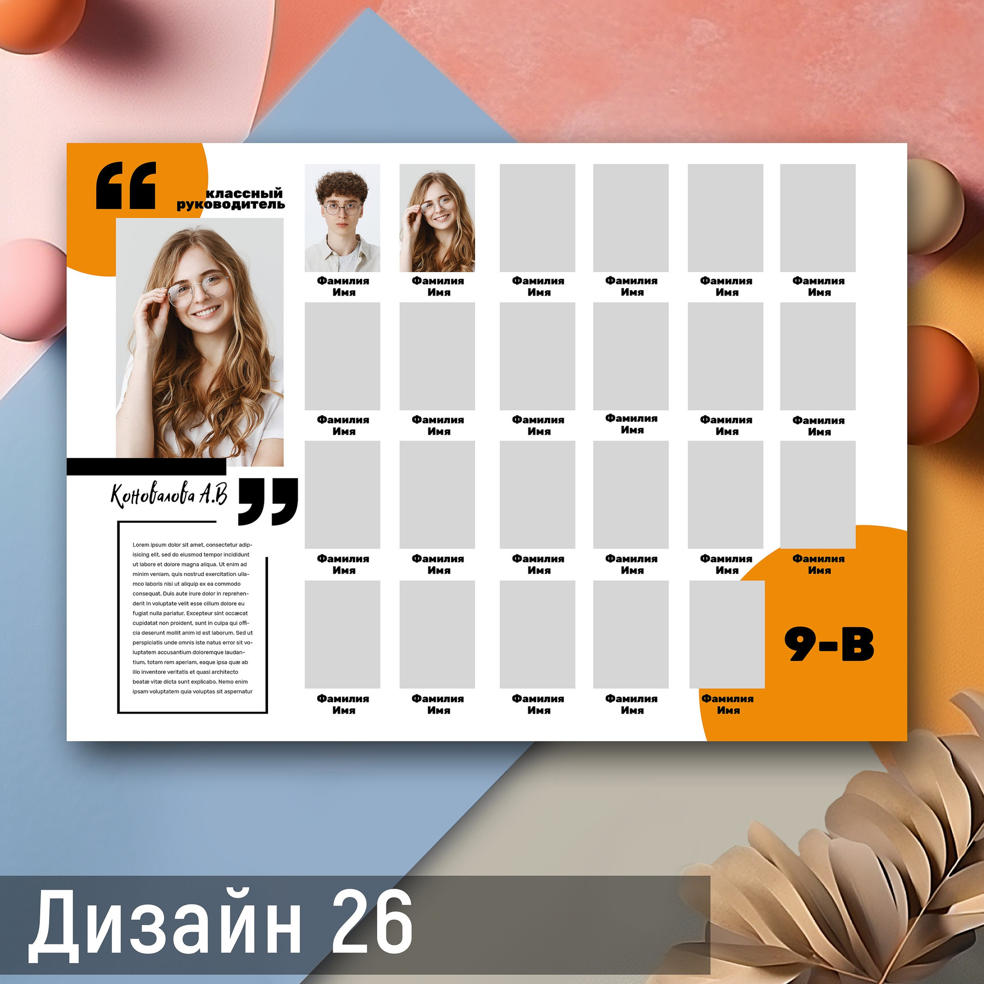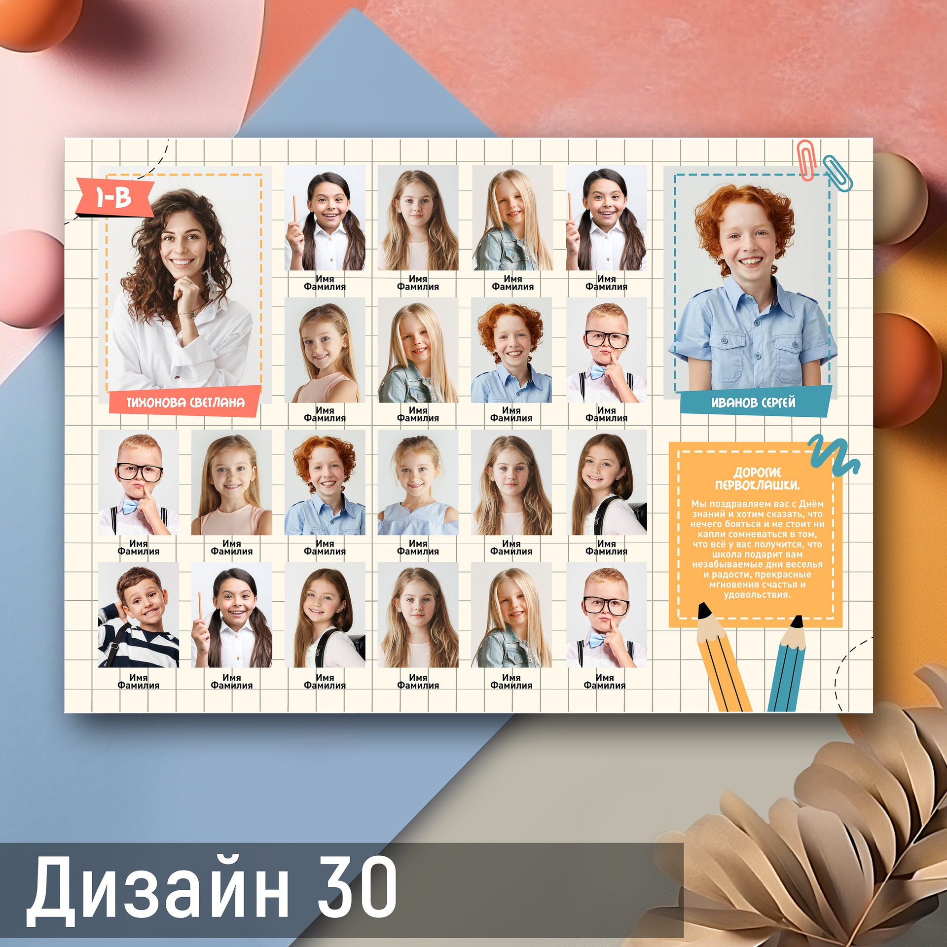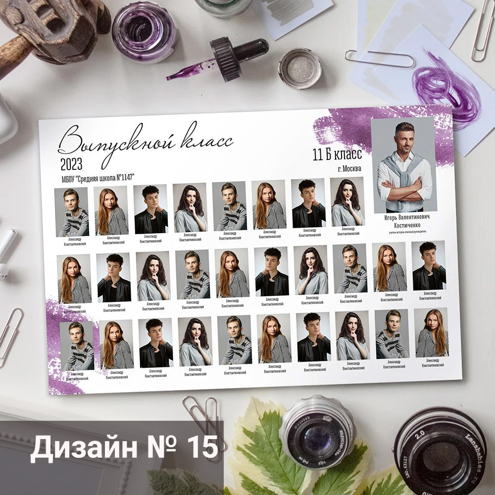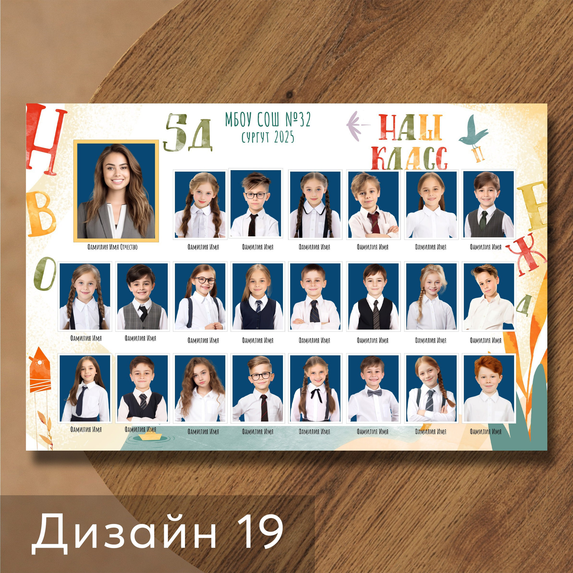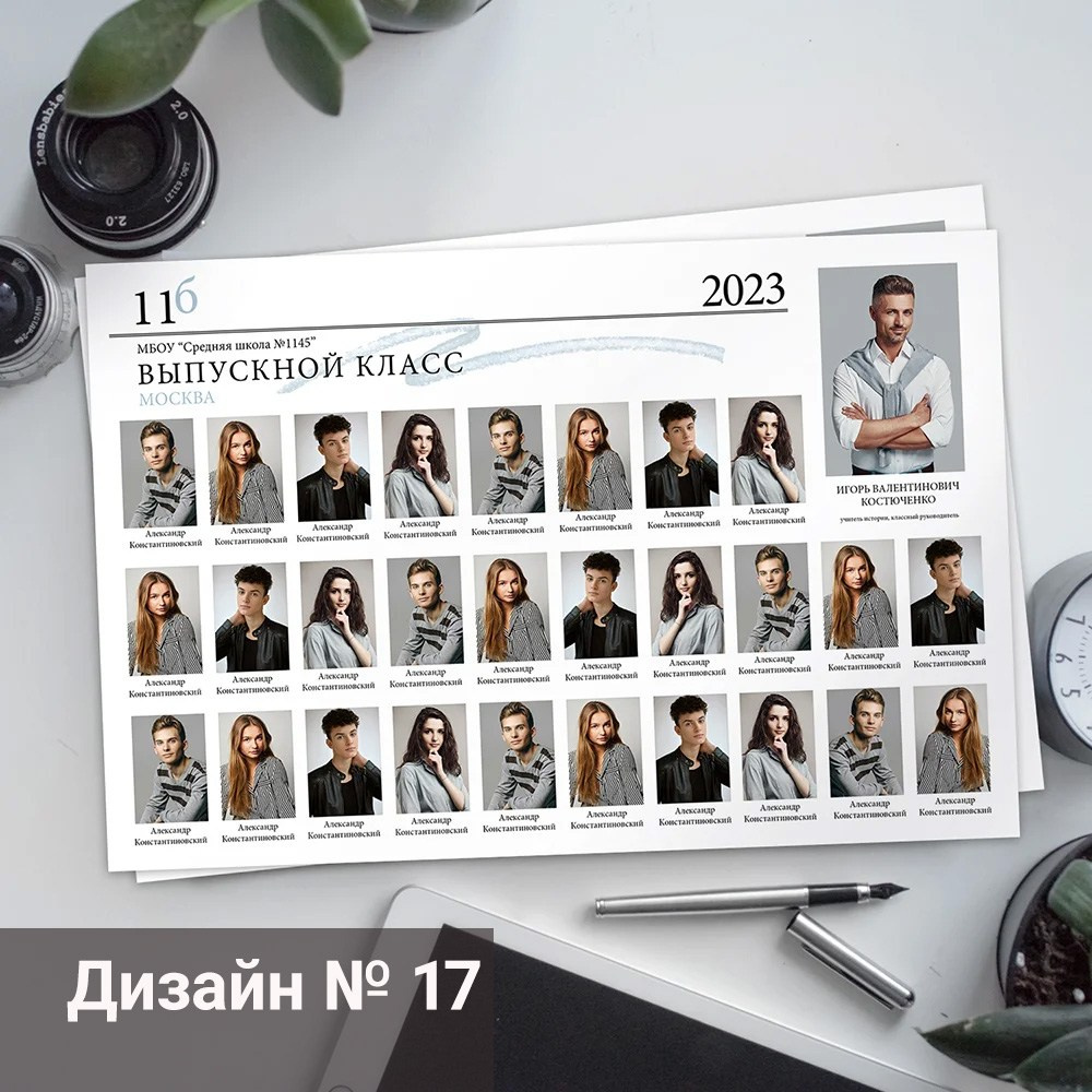 - ✔️ Фон портретов, вид и расположение портретов на виньетке может отличаться от представленных, в зависимости от количества учеников и метода съемки (фото стоя либо за партой).